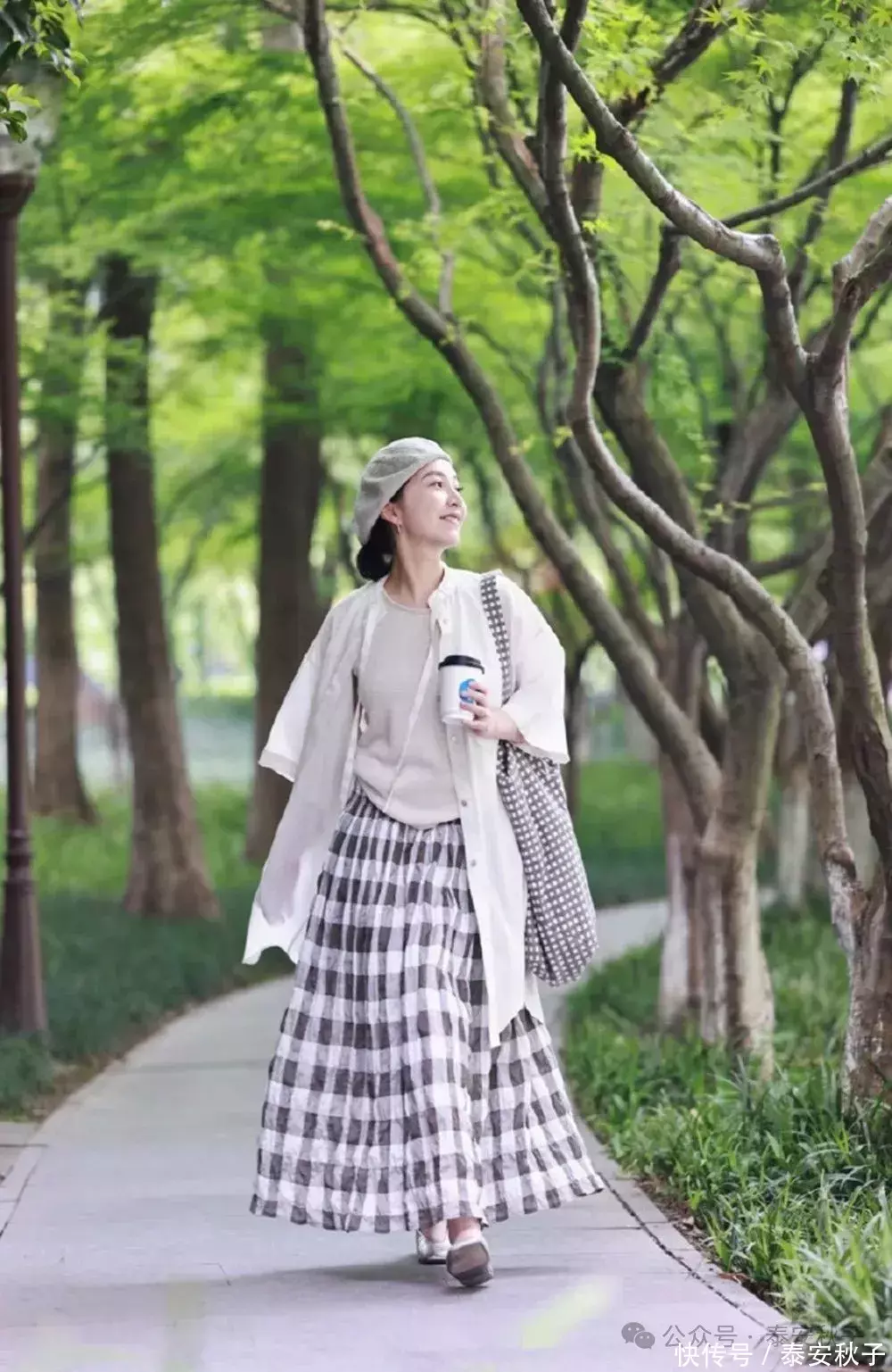 比如博主小闪穿的这条黑白格纹长裙,选的是雪纺或是苎麻的面料,轻盈浪漫感十足。