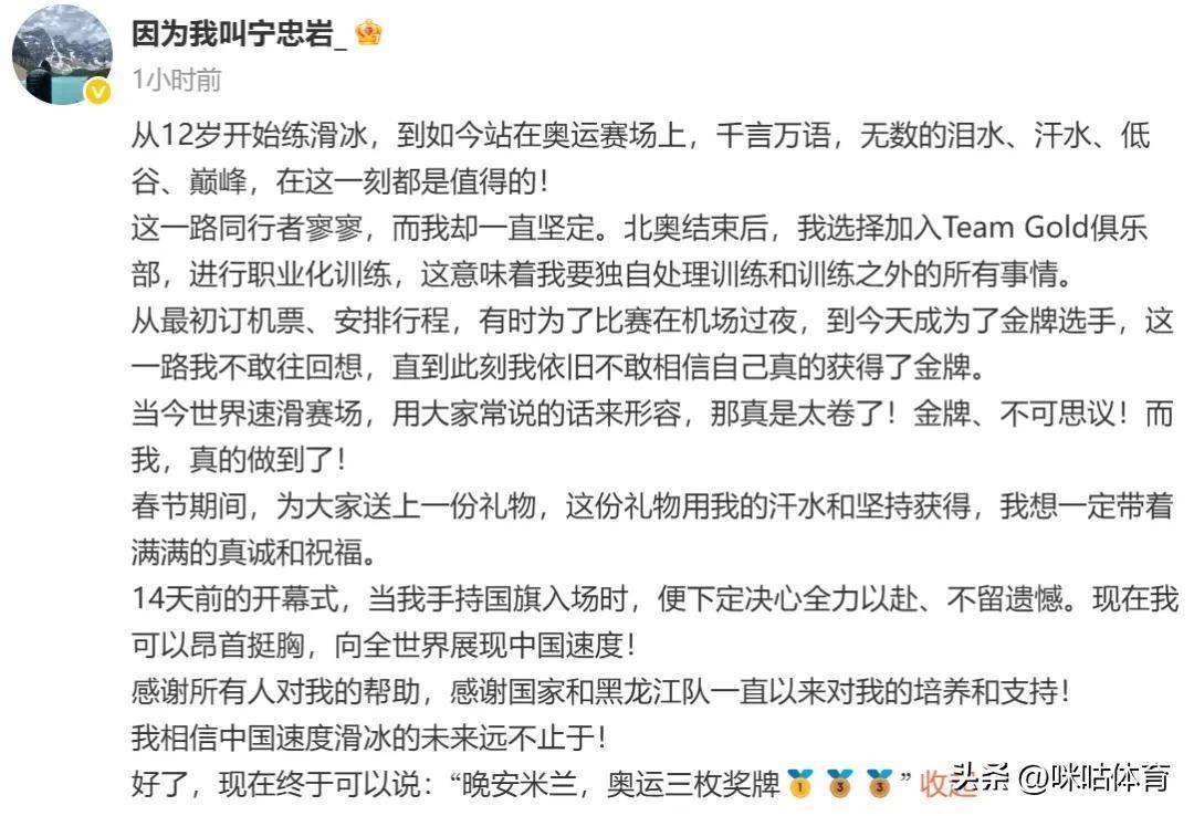 四年前,宁忠岩在北京冬奥会无缘领奖台。而如今,宁忠岩在米兰冬奥会收获1金2铜。