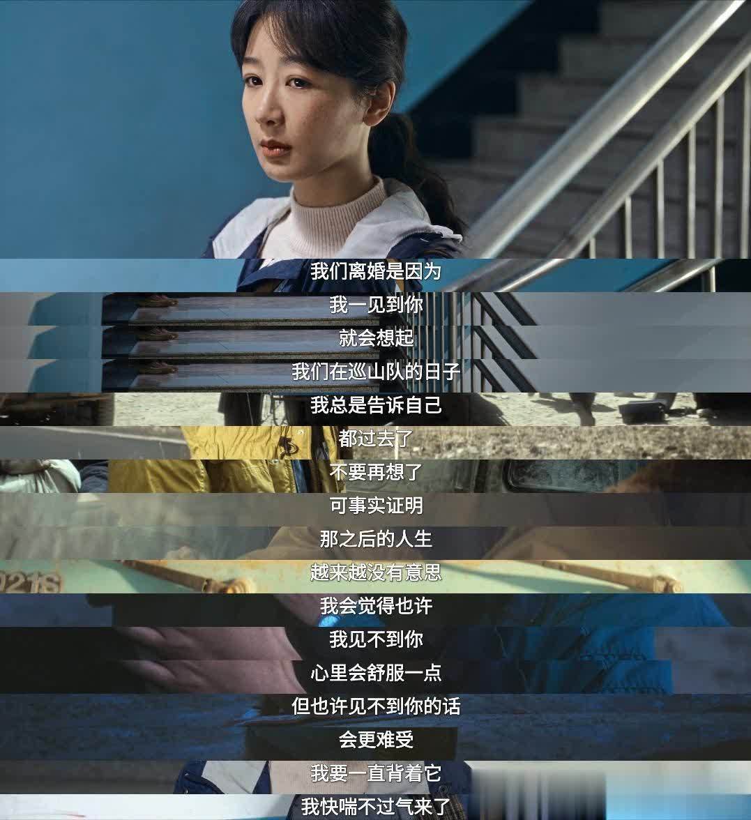 “我们离婚,是因为我一见到你,就会想起我们在巡山队的日子。我总是告诉自己,都过去了,不要再想,可事实证明,那之后的人生越来越没意思。我会觉得也许,我见不到你心里会舒服一点,但也许见不到你的话会更难受。在巡山队一年多,是我人生中最重要的时光,重要到我要一直背着它,我感觉我快喘不过气来了。那种感觉,也许只有你能知道。”