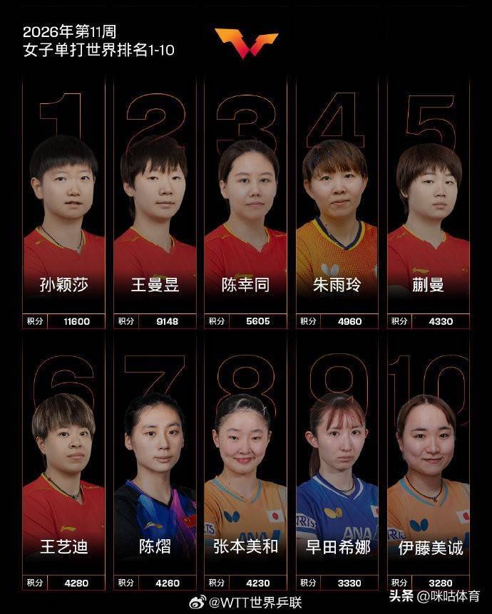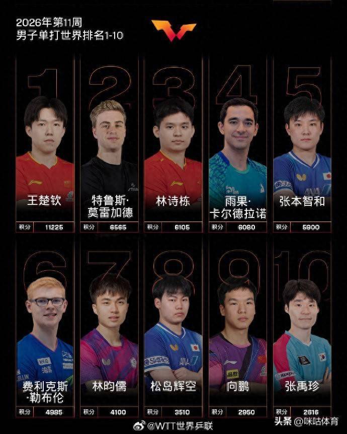 3月9日南方配资平台,国际乒联公布了2026年第11周世界排名,王楚钦和孙颖莎排名男女单打第一!