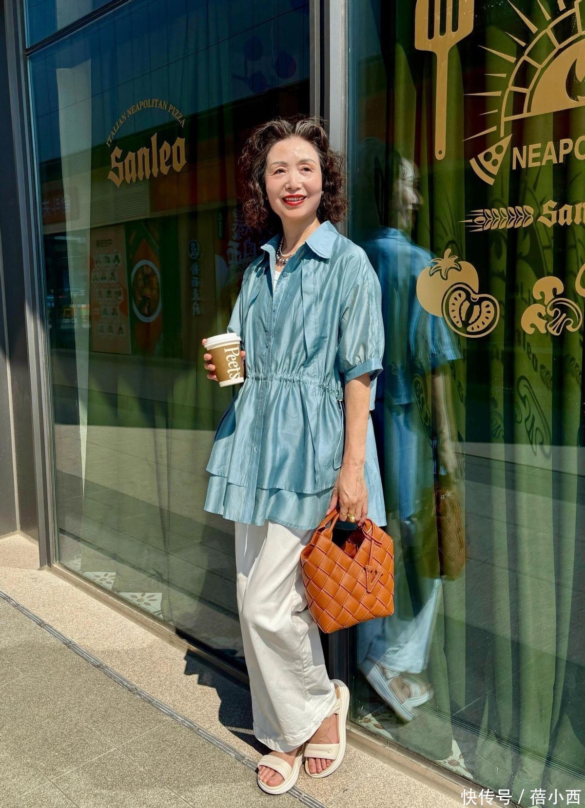浅蓝色衬衫自带温柔感,抽绳设计巧妙又别致,搭配上简约的白色阔腿裤,舒适又大气。再拎上那只棕色编织包,瞬间增添时尚亮点。日常这么穿,好看又自在。