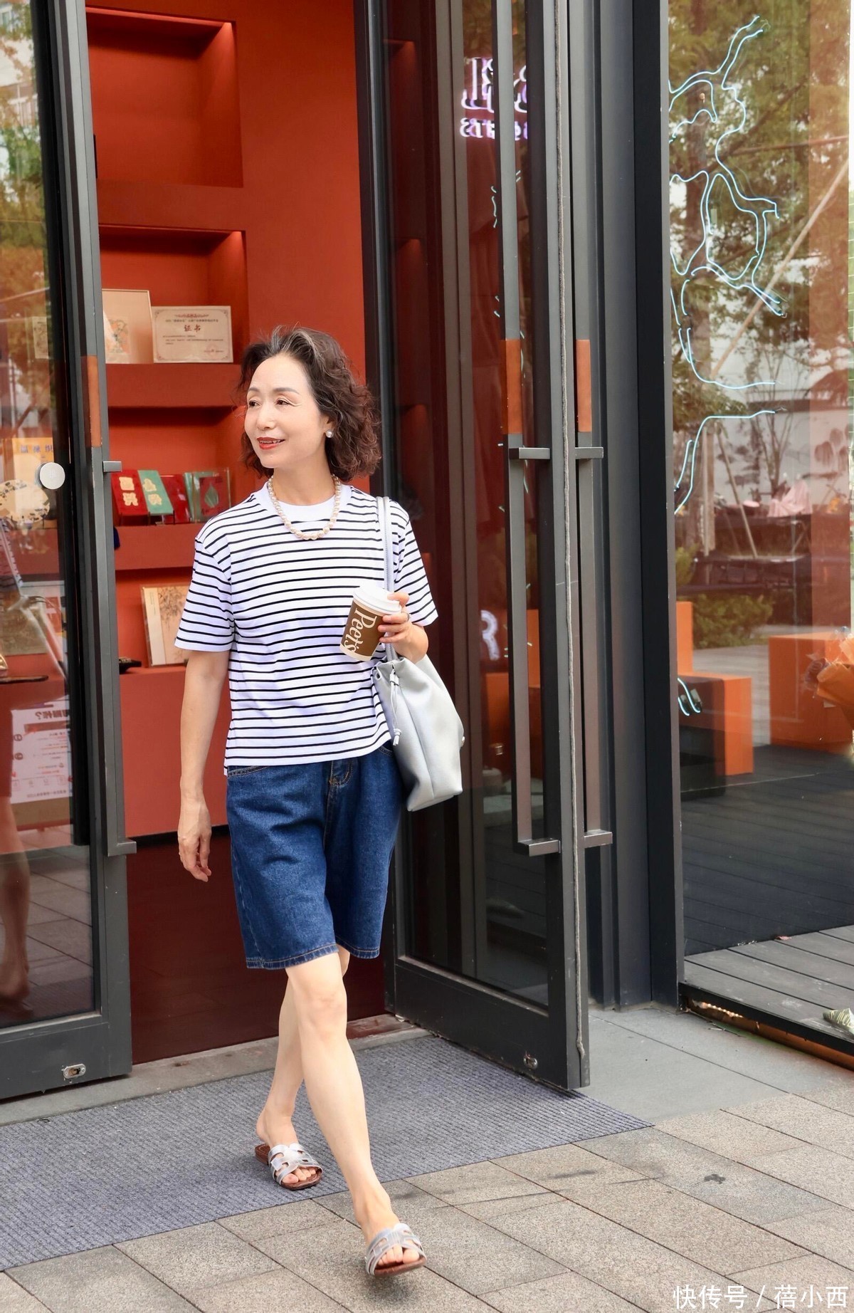 黑白条纹T恤清爽百搭,搭配蓝色牛仔短裤,既舒适又显年轻。脚上的灰色拖鞋和手提包颜色柔和,整体感觉很温柔自在。